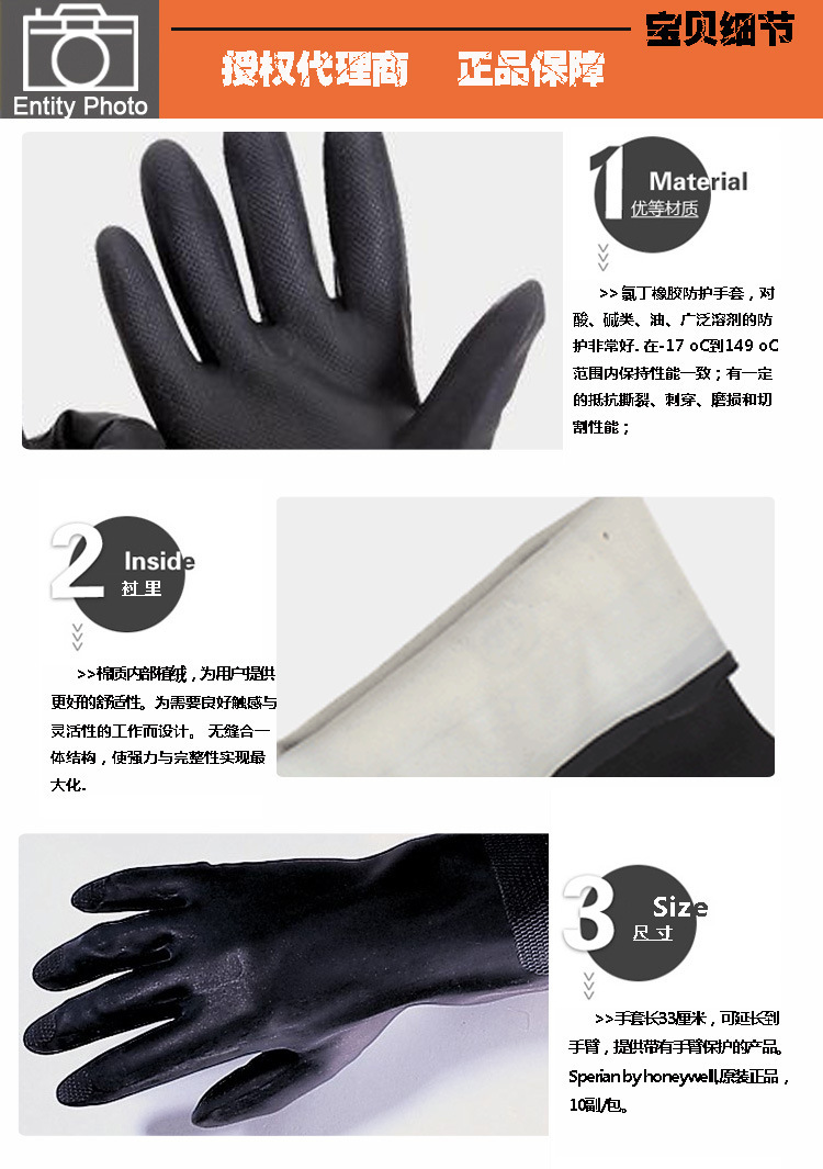 产品描述:EN374-3正庚烷,40%浓度苛性钠,96%浓硫酸耐渗透测试,EN388,防护级别3101,手套表面印有小圆形防滑纹路,内测为高密度喷棉涂层。