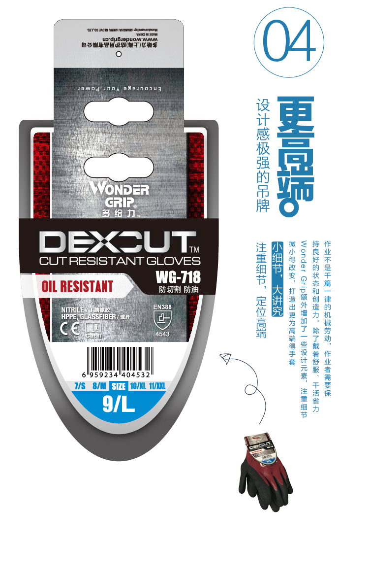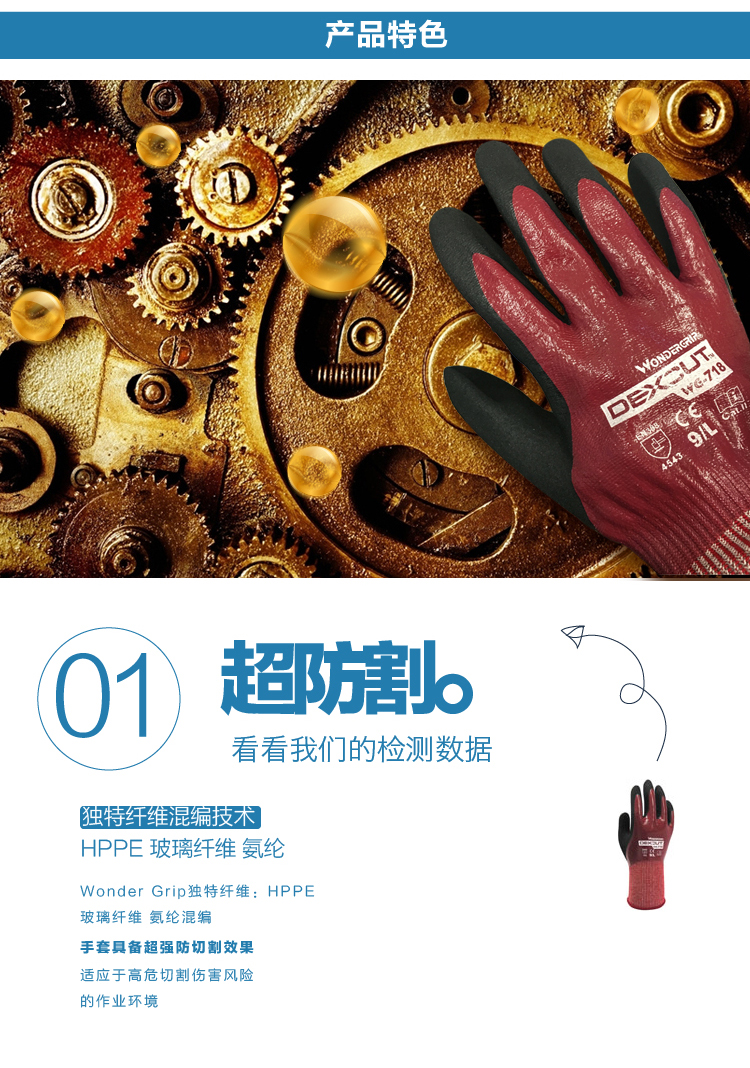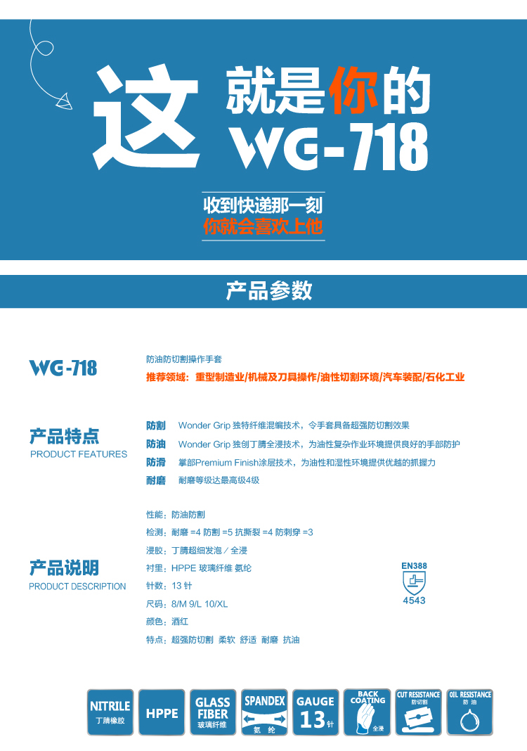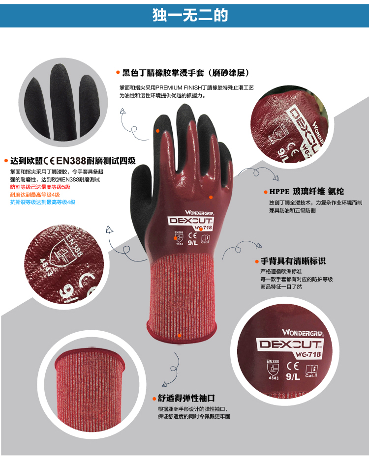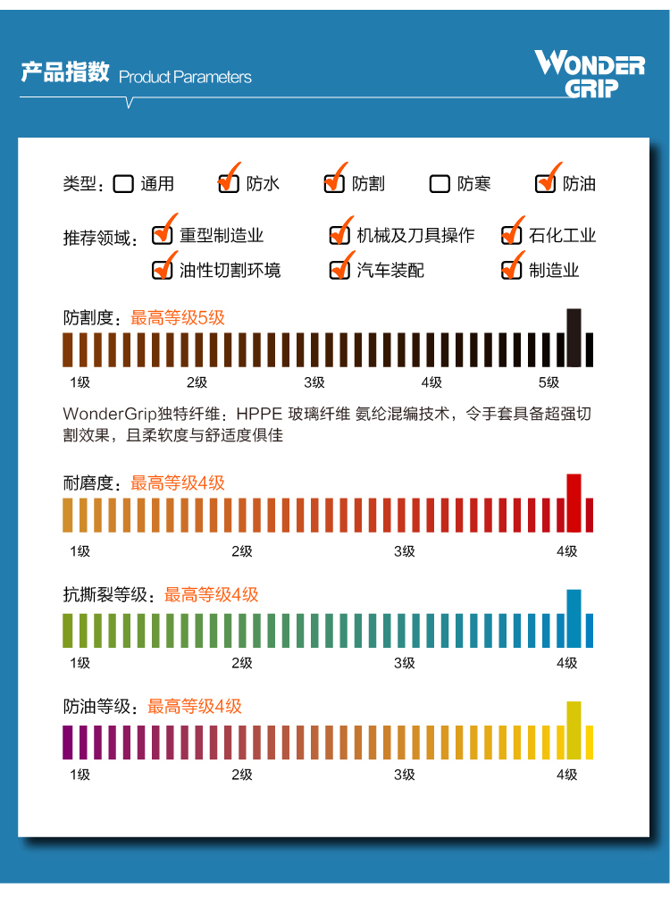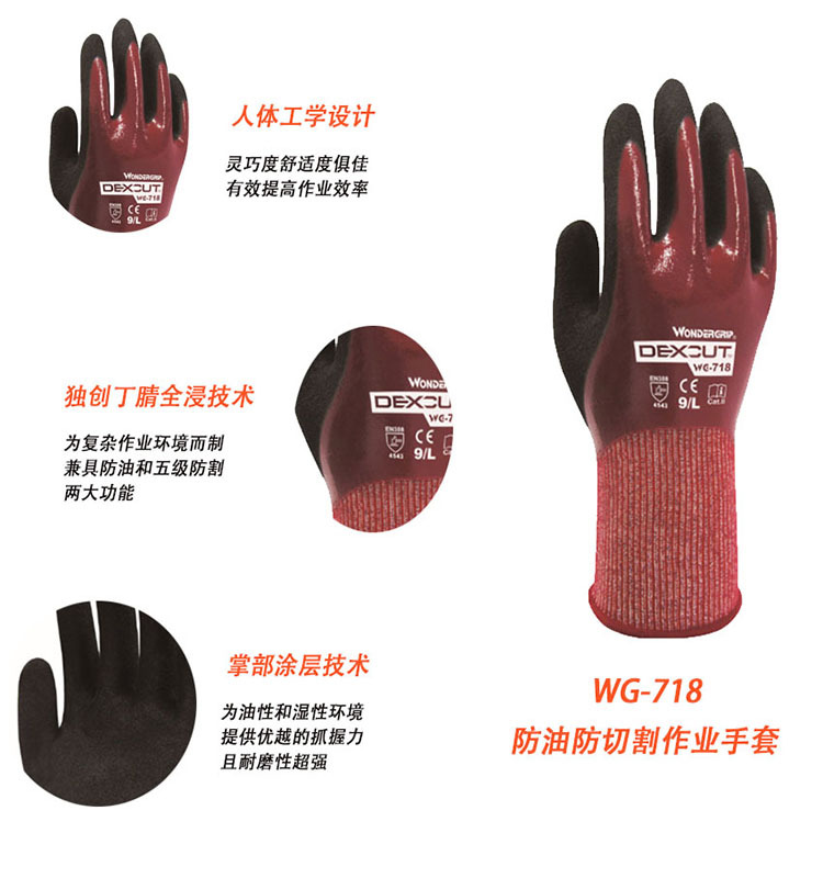 WonderGrip多给力WG-718耐油型五级防切割作业手套