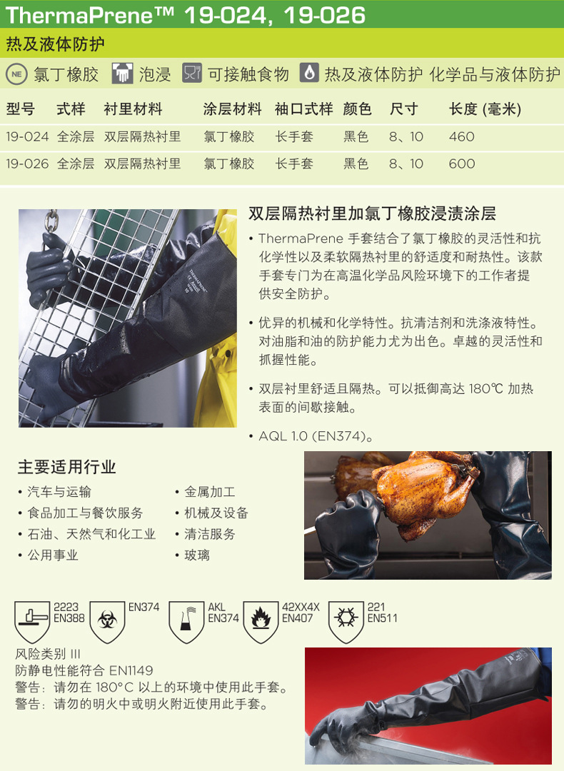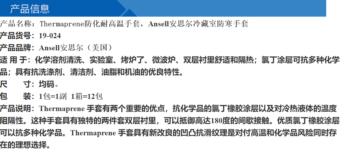 安思尔(Ansell)ThermapPrene 19-024 氯丁橡胶隔热防化手套