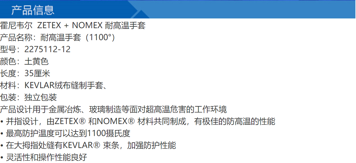 Honeywell霍尼韦尔2275112 ZETEX 1100度高性能隔热手套