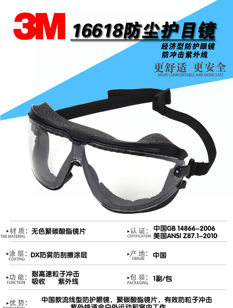 3M 16618防尘密封护目镜(无色镜片、DX防雾防刮擦涂层)