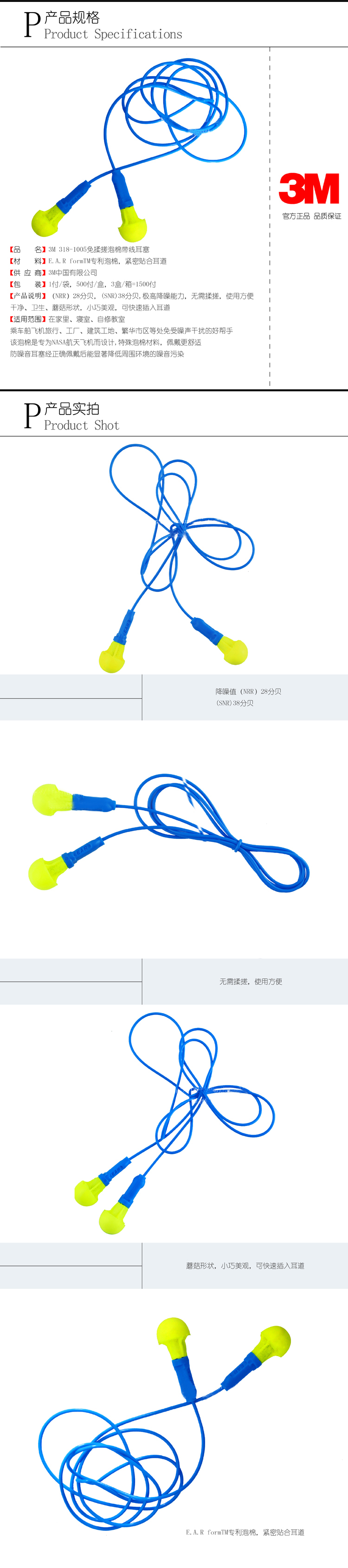 3M 318-1005免揉搓泡棉带线耳塞