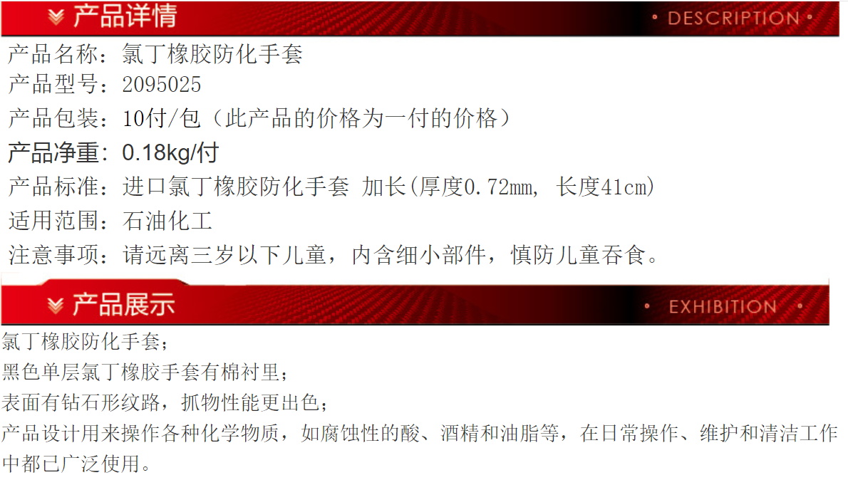 霍尼韦尔2095025氯丁橡胶防化手套(加长)