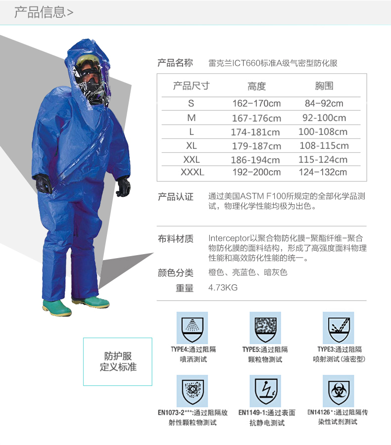 雷克兰Interceptor系列防化服产品前所未有的将面料强韧结实与抗化性能最佳结合。经美国ASTM F1001的严格测试,抵御所规定的21种具有代表性的危险化学品测试结果全部达到最高防护效果,适用于各类化学品操作环境。