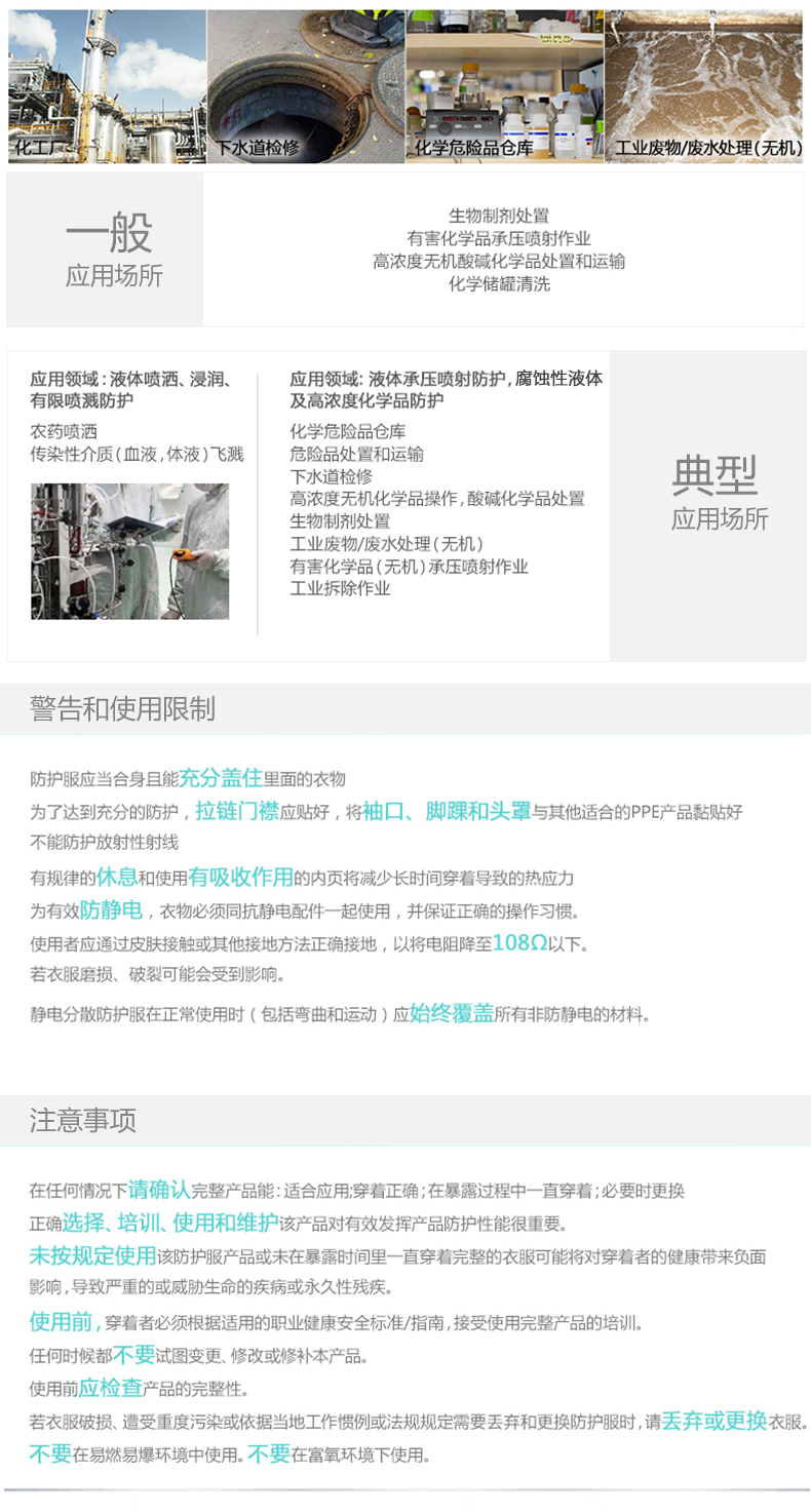 适 用 于:化工、制药、石油和消防等行业、罐体清洗、设备检修、维护、紧急事故处理、污染环境清理、军事及警用装备、医疗卫生及疾病预防控制、核工业放射性颗粒物、粉尘防护
