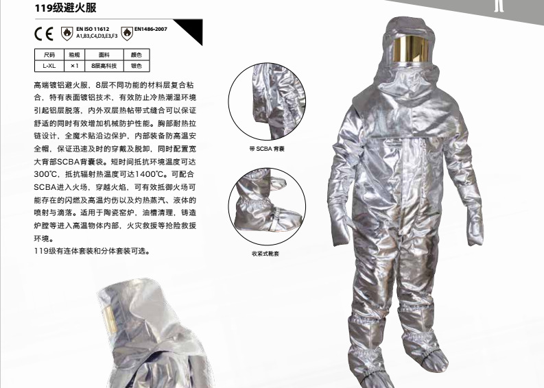 ● 高端镀铝避火服,8层不同功能的材料层复合粘合,特有表面镀铝技术,有效防止冷热潮湿环境引起铝层脱落,内外双层热帖带式缝合可以保证舒适的同时有效增加机械防护性能。