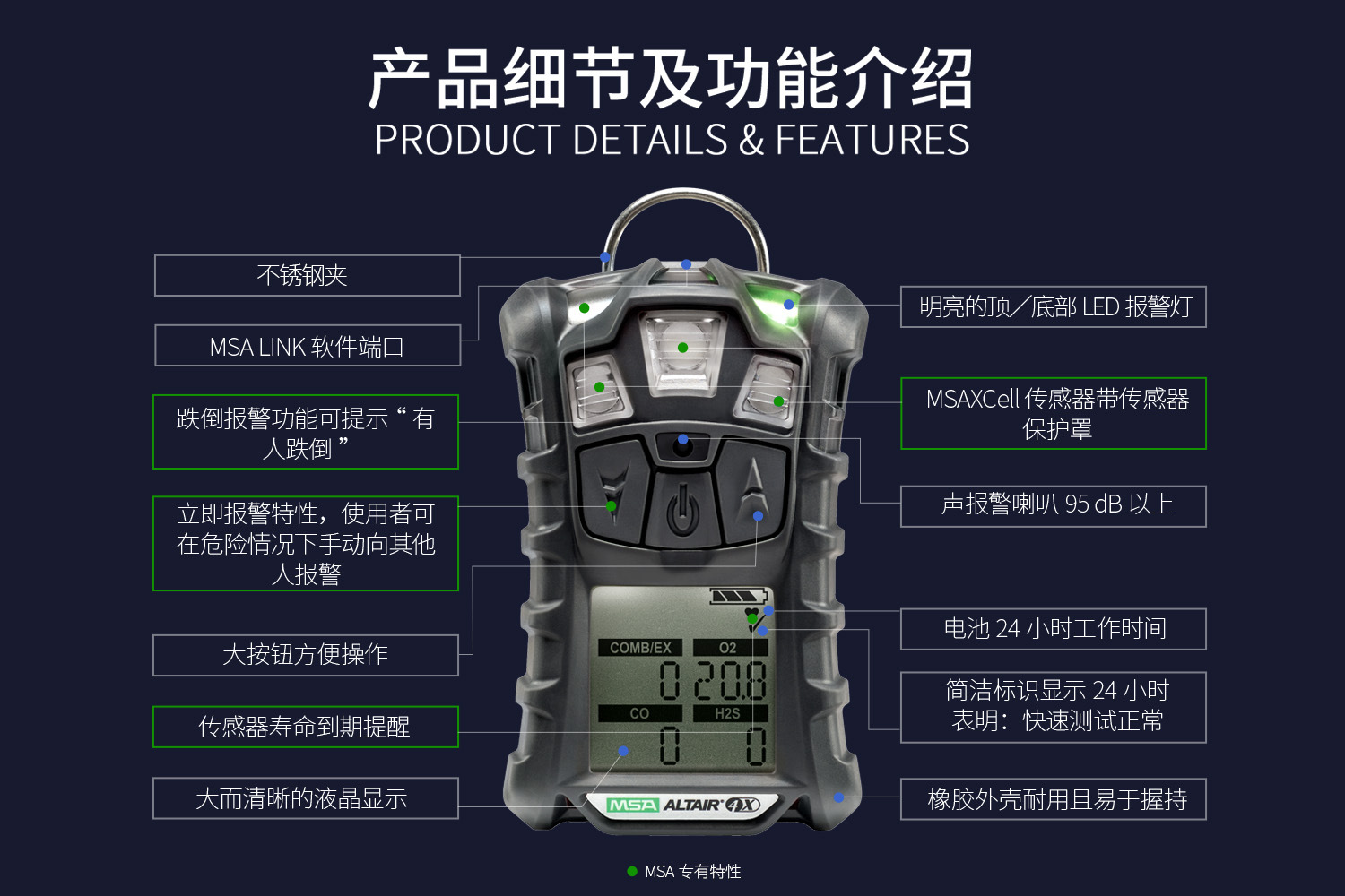 ·业内独家提供三年质保,安全更有保障:从内到外的安全理念;内置MSA独家研制的X智能传感器,从容应对各种苛刻使用环境下对检测仪产生的损伤