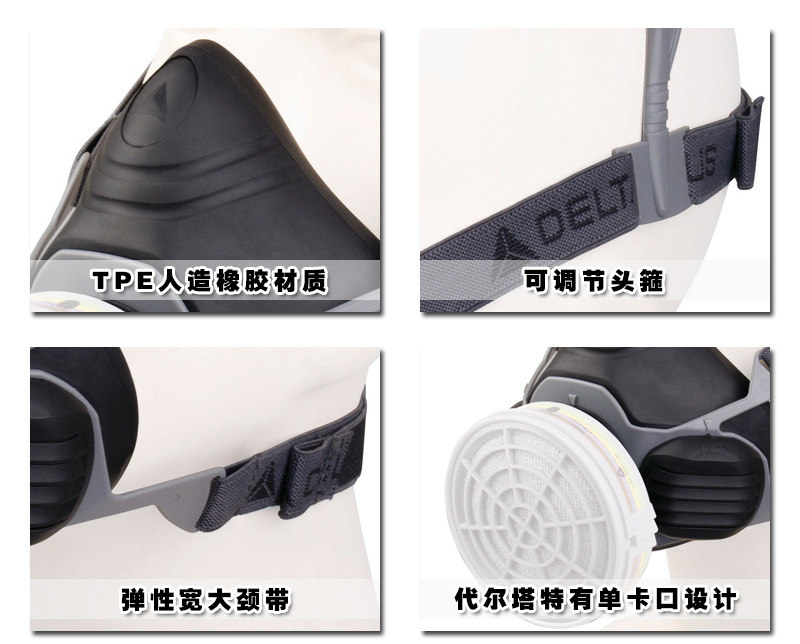 M6000系列单滤盒半面罩,TPE人造橡胶材质,可调节头箍,弹性宽大颈带,佩戴舒适方便,代尔塔特有单卡口设计,配合M6000滤使用。