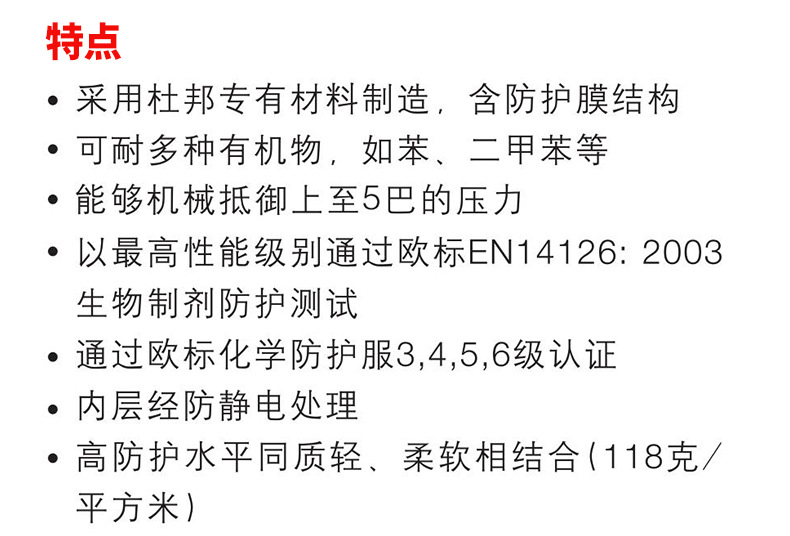 内层经防静电处理高防护水平同质轻、柔软相结合(118克/平方米)