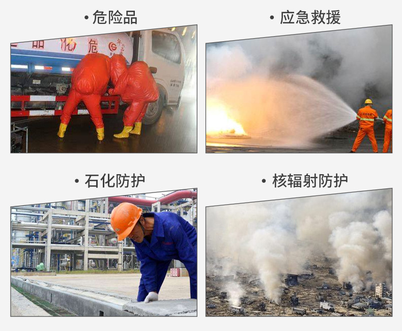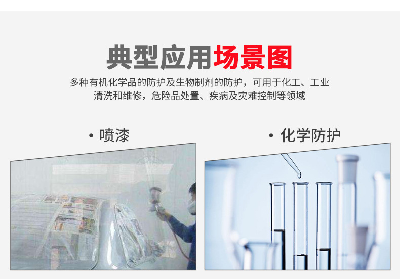 主要用途:多种有机化学品的防护及生物制剂的防护,可用于化工、工业清洗和维修,危险品的处置、疾病及灾难控制等领域。